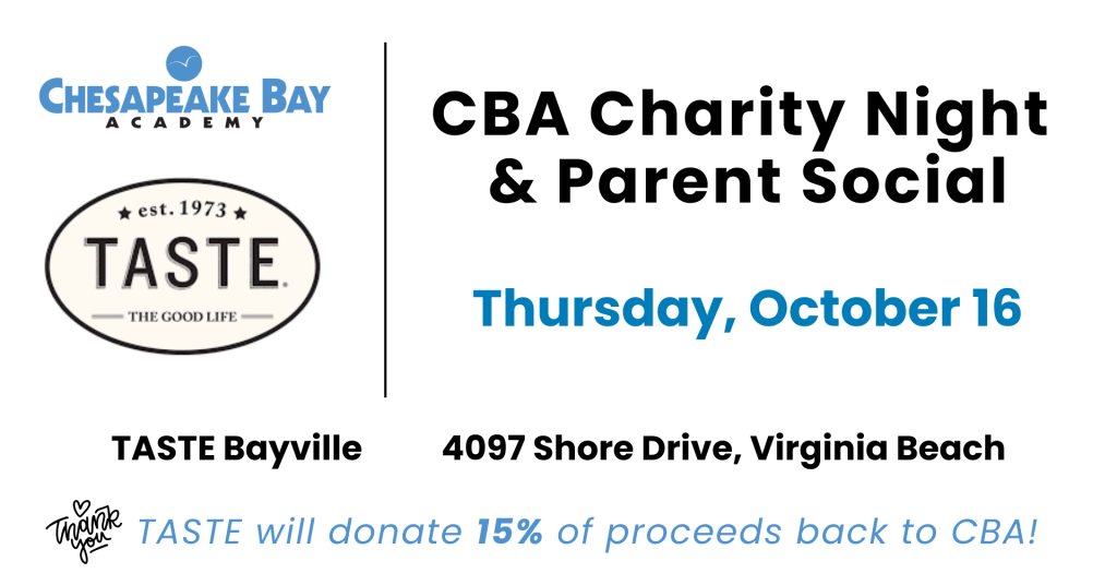 Join us on Thursday, October 16th from 3:30 – 6:30pm for a CBA Family Social at the TASTE Bayville Location!