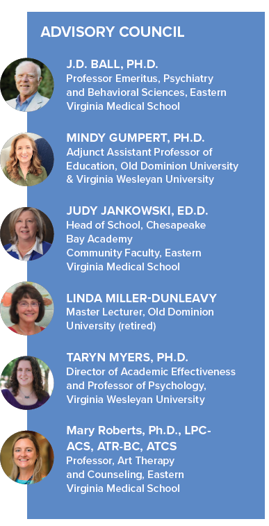 At this writing, CERTI has moved beyond being brand new to the point that it is now a new brand for CBA. This story begins with CERTI’s Advisory Council, comprised of an incredibly talented group of experts in their fields. Leading the way was Dr. J.D. Ball, long-serving Chair of CBA’s Education and Research Committee. Dr. Ball spent more than three decades at Eastern Virginia Medical School (EVMS) serving as a clinical neuropsychologist and lecturer. Joining Dr. Ball on the Advisory Committee are Dr. Mindy Gumpert from Old Dominion University (ODU), Linda MillerDunleavy also retired from ODU, Dr. Taryn Myers from Virginia Wesleyan University (VWU), and Dr. Mary Roberts also from EVMS. And, of course, Dr. Judy Jankowski, Head of School at CBA.