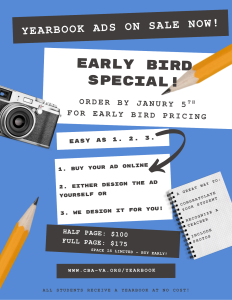 Families have the option to design their own ad, or we will do it for you! Once you have placed your order, you will be contacted by CBA’s Yearbook Advisor with more details.
