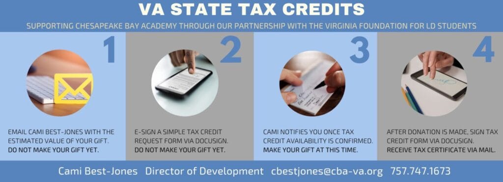 Gifts made through a Virginia state tax credit program can directly reduce the amount of Virginia state taxes owed. In addition to the state credit, donors may also receive a deduction against taxable income on both federal and state income taxes. The opportunity to receive state tax credits is now open to new donors! Chesapeake Bay Academy participates in two Virginia state tax credit programs through our affiliation with the Virginia Foundation for LD Students (VFLDS). To ensure you are eligible to receive credits for a charitable contribution and to request a simple form to get the process started, contact Cami Best-Jones, director of development, 757.747.1673 or cbestjones@cba-va.org